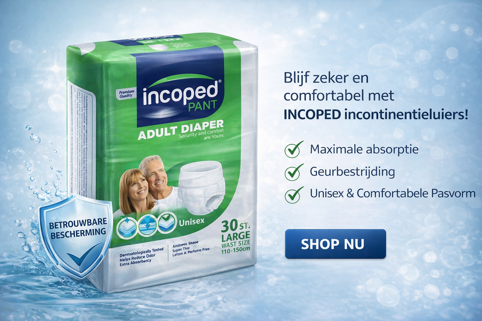 Incoped Pants Large Incontinentiebroekjes – Unisex & Discreet Betrouwbare bescherming met maximaal draagcomfort. Incoped Pants Large incontinentiebroekjes zijn ontworpen voor mannen en vrouwen die zekerheid en vrijheid willen bij urine- en fecale incontinentie, zonder in te leveren op comfort of discretie. De broekjes beschikken over een super-absorberende kern met gelijkmatige vochtverdeling, waardoor de huid droog en comfortabel blijft. Het ademende en huidvriendelijke materiaal helpt huidirritaties te voorkomen en is geschikt voor langdurig gebruik. Dankzij de geïntegreerde Odour Neutralizer worden onaangename geurtjes effectief verminderd. Ammoniakgeuren worden tot wel 12 uur geneutraliseerd, zodat u zich de hele dag fris en zelfverzekerd voelt – thuis en onderweg. De elastische pasvorm sluit goed aan op het lichaam en biedt optimale bewegingsvrijheid. Het superdunne ontwerp zorgt ervoor dat de broekjes discreet onder kleding gedragen kunnen worden. Bovendien zijn ze lotion- en parfumvrij, dermatologisch getest en vriendelijk voor de gevoelige huid.